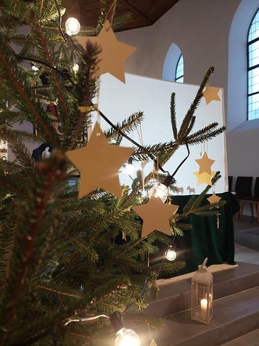 „Wartet! Ich komme!“ Eilig verließ der kleine Stern seinen Himmelsplatz und machte sich auf den Weg. Dieses Licht musste er sich unbedingt ansehen. Vielleicht war es ja wirklich für ihn bestimmt? „Jawohl!“, murmelte der kleine Stern auf seinem Weg erdwärts. „So wird es sein. Sie rufen mich mit ihrem Licht, so wie sie es im letzten Jahr getan haben. Ich glaube, sie feiern wieder ein Fest und erwarten mich.“ Er war sich nun sicher und die Freude in ihm wurde groß und größer, je mehr er sich dem Dorf mit der Kirche, der Lichtertanne und der Krippe näherte. Doch als er in der Kirche ankam, war alles still und dunkel. Auch das wunderhelle Licht war verschwunden. Es herrschte tiefe Nacht und die Menschen, die hier sonst waren, schliefen. Nur bei der Weihnachtskrippe schimmerte schwach das Licht einer Kerze, doch es verlor immer mehr seine Kraft und erlosch schließlich. Dunkel war es geworden. Behutsam glitt der kleine Stern näher und setzte sich auf das Dach des Krippenstalles. Dort blieb er die ganze Nacht und schenkte dem Kind und seinen Eltern, den Tieren und Hirten sein weiches, warmes Licht. Das war gut so und viel festlicher als das allerschönste Fest.